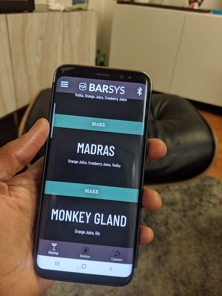 Barsys connects to a mobile app via Bluetooth, where users can pick their drink of choice and the number of servings and the device will get started preparing the drinks. The device can support up to three Bluetooth connections, allowing multiple users to put in their drink orders.