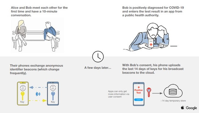 Apple and Google will use several months to build into the core of their own operating systems, the functionalities that will allow the upcoming public health apps to enable a wide-range Bluetooth-based contact tracing platform.
