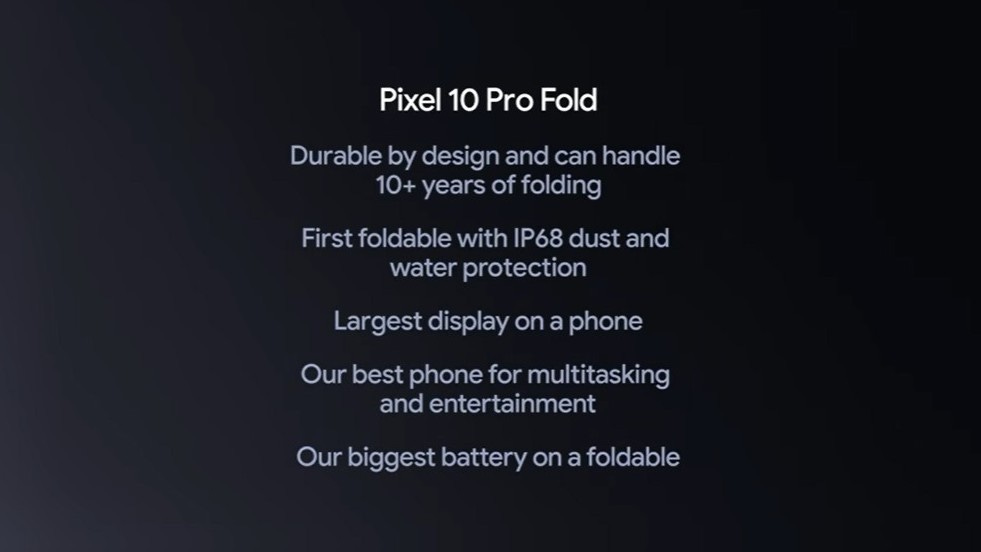 The Pixel 10 Pro Fold introduces a unique feature to the foldable space, as it is the first to feature a IP68 water and dust resistance rating on a moveable screen. With all of the durability improvements added to the foldable, Google claims it can support up to 10 years of folding. The device features a 6.4-inch outer display and 8-inch Super Actua Flex display, both with 3000 nits brightness. The foldable comes in two color options, Moonstone and Jade. The Pixel 10 Pro Fold includes the biggest battery ever featured on a foldable device at 5015mAh, with Google claiming it can last over 30 hours, and can fast-wired charge 50% in 30 minutes. The foldable also supports Pixelsnap Qi2-certified wireless charging up to 15W. Other hardware includes 16GB of RAM and 256GB/512GB/1TB of internal storage with Zoned UFS for the largest two options. Like the other devices, the Pixel 10 Pro Fold benefits from several AI features, such as Magic Cue, which assists you in identifying important tasks, activities, addresses, and more from your most used apps, including Gmail, Calendar, Screenshots, and Messages.