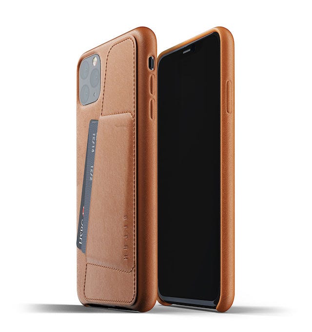 iPhone 11 series accessories from Mujjo include its full leather case and wallet case. Color options include Black, Tan, Monaco Blue, and Alpine Green.