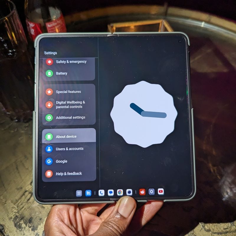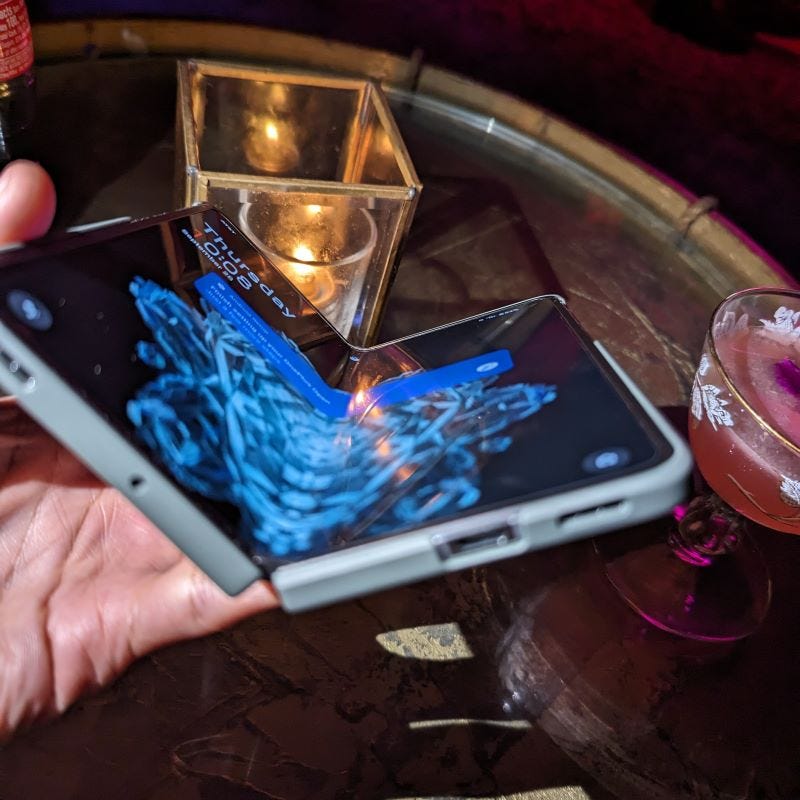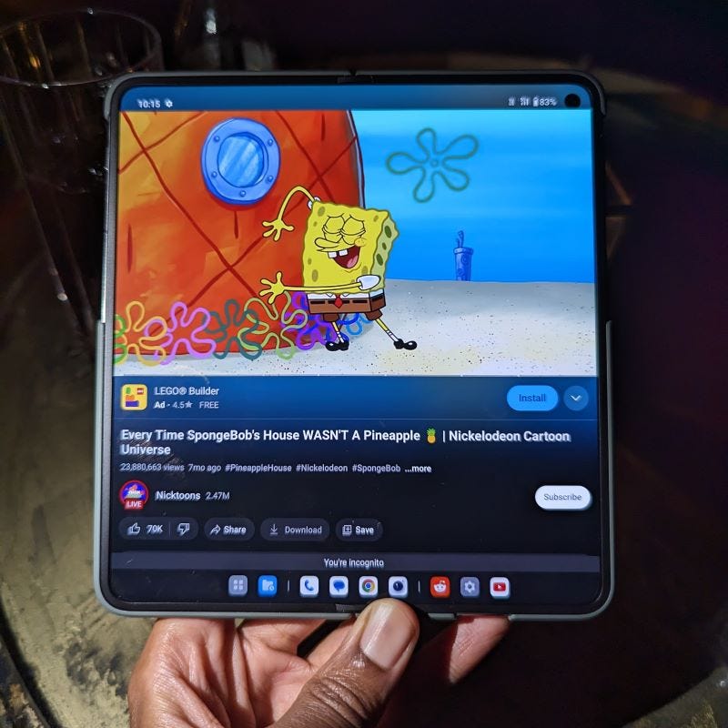 Viewing-wise, the foldable did decently in a dim environment. While I spent most of my time in photoshoot mode with the flashlights of other phones as makeshift lighting, I got what I needed for the phone quality. Loading a few quick cartoon scenes gave a basic idea of the color depth. OnePlus included a movable crystalline structure as its background, demonstrating not only the functionality of the foldable display but also the high contrast of dark and light colors. The screen itself attracted a lot of fingerprints. I suppose that should be par for the course.