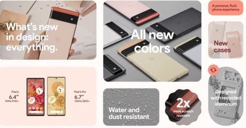 The Pixel 6 features a 6.4-inch FHD+ display with a 20:9 aspect ratio, a Google Tensor chip and Titan M2 security chip, 8GB of RAM, and 128GB and 256GB UFS 3.1 storage options, a 4,614 mAh battery, and Android 12 software.