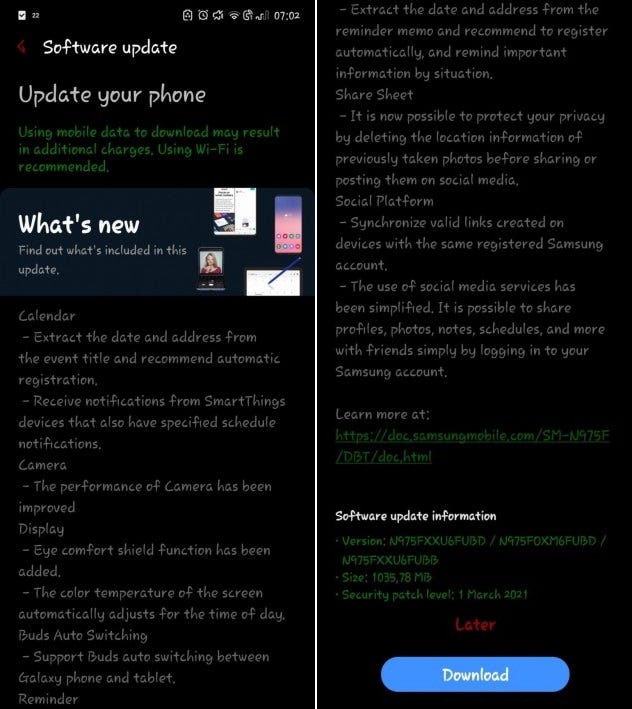 But the Galaxy Note 10 series is the first to get access to the N97xFXXU6FUBD update version in Germany, and the original Galaxy Fold is getting the F900FXXU4EUBF version in France, according to sources at SamMobile. The over 1GB firmware contains the One UI 3.1 update and the March 2021 security patch. Due to its size it is advisable that users download the update over a Wi-Fi network. Users who have not yet received an automatic update to their device can initiate the update by accessing Settings > Software update > Download and install on a Galaxy Note 10 or Galaxy Fold handset.