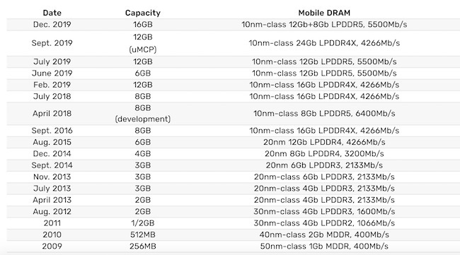 Samsung also detailed its history of DRAM development, starting in 2009 with 256MB modules. By the time the manufacturer began developing 4GB modules in 2014 the industry began questioning how much RAM is too much for a mobile device; however, seemingly led the way as many other Android manufacturers, and eventually, even Apple began outfitting its devices with more memory. Still, Apple has remained more conservative as its current most premium smartphone model, the iPhone 11 Pro Max includes 4GB of RAM.