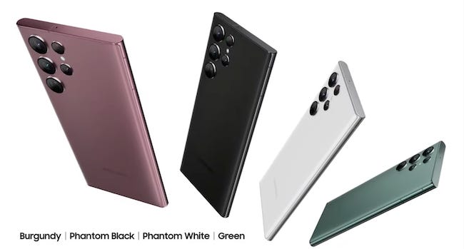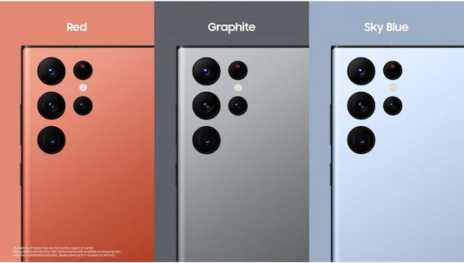 Color options for the Galaxy S22 Ultra include Phantom Black, Phantom White, Green, and Burgundy, with Red, Graphite, and Sky Blue as additional, online-only colors.