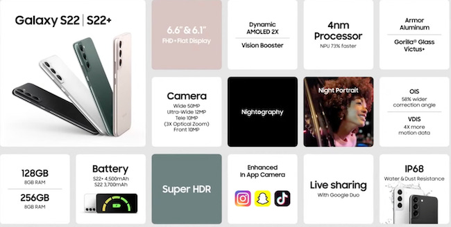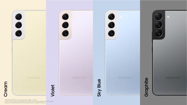 Color options for the standard Galaxy S22 and Galaxy S22 Plus include Phantom Black, Phantom White, Green, and Pink Gold, in addition to Cream, Violet, Sky Blue, and Graphite options, which are available online only.