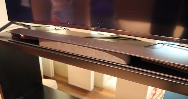 The Alto 9+ Soundbar prototype revamps the traditional linear soundbar design with backward tilted side speakers that TCL calls RAY-DANZ Technology. The unique shape and placement of these speakers allow for acoustic and peripheral sound so reach content consumers, wherever they are in a room. The front-firing speaker focuses on speech and dialogue, while the wireless subwoofer focuses on bass, maximized by Dolby Atmos.