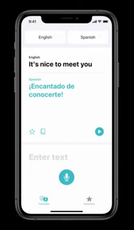 Translate app - Now supports 12 languages, including English, Mandarin Chinese, French, German, Spanish, Italian, Japanese, Korean, Arabic, Portuguese, Russian. The app works offline with on-device machine learning. Users can turn their iPhone to the side to enable conversation mode so two people can speak and translate in real-time.