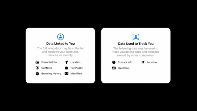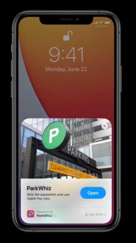 App store - App Clips allows users to install small versions of apps to use features as needed. Less than 10MB in size and works with Apple Pay and Apple sign in. Can be launched from the web, messages, Maps, NFC tags, QR codes, or App Clip codes.
