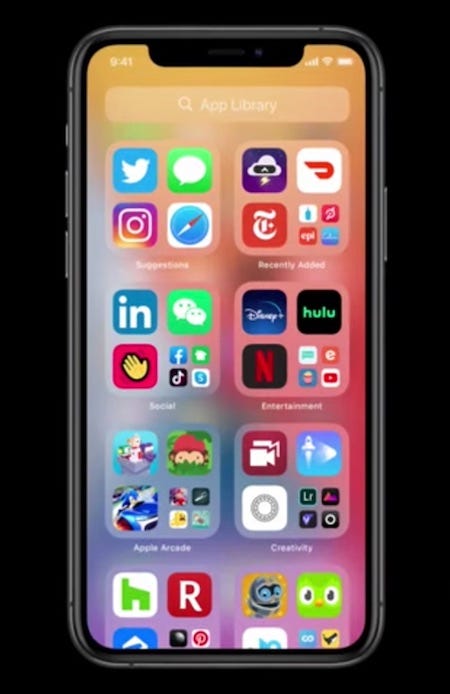 App Library - Organize apps into curated folders in order to keep iPhone homepage easy to navigate in one or two swipes. Users can hide extra pages, which will then will show up in this condensed app library. There are also search, suggestions, recently added options for easily finding apps that may not be on primary homepages.