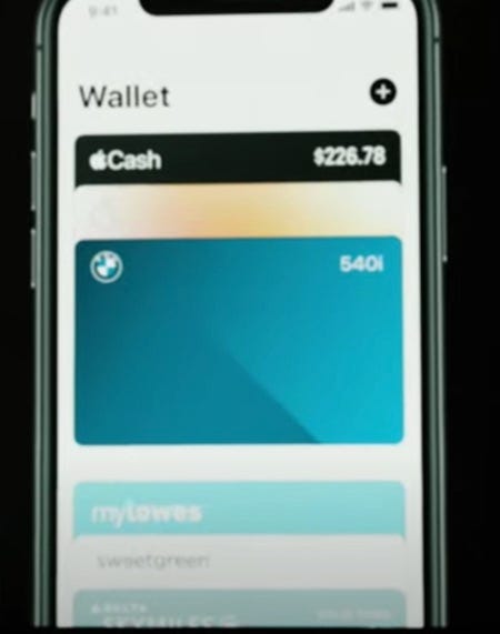 Carplay - Wallpaper and app updates. Digital keys with iPhone. First car with support is the 2021 BMW 5 series. Tap to unlock with NFC. Place phone on the charging pad to start the car. Users can share keys with others through iMessage and set access restrictions, such as for teen drivers. Users can turn keys off remotely through iCloud. UI chip will make a standard for different car brands and will allow users to unlock car without having to take their phones out. The chip will be standard in new ars starting next year.