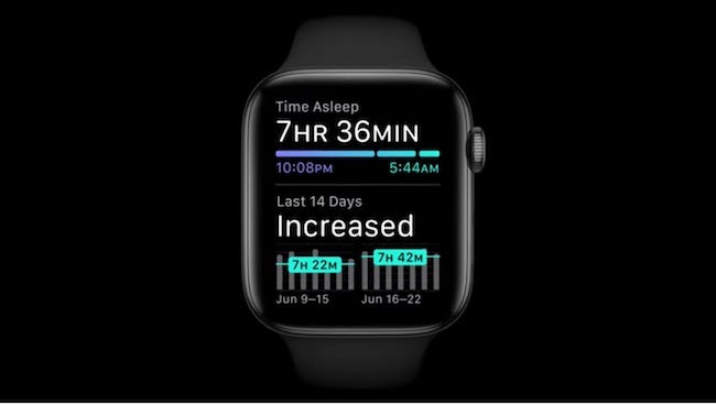 Sleep tracker, Wind down feature enables screen dimming, do not disturb and other aids as users prepare for sleep. Sleep mode shuts down Apple Watch during sleep timeframe. Sleep schedules measures sleep patterns and quality.