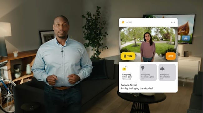 Secure video defines activity zones and face recognition. HomePod announces who's at the door. Apple TV provides live view when someone rings the doorbell.
